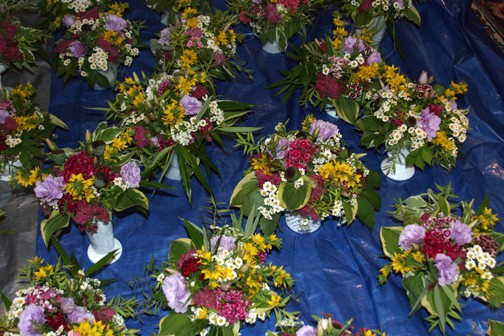The arrangements are coming out beautifully. I added lavender Lisianthus from Fifty Flowers, but all the other ingredients come from my garden. The flowers include sweet William, Spirea (Magic Carpet, Double Play Artist) hosta leaves, Lysimachia punctata, roses, feverfew, Spirea Ogon and Salix foliage.