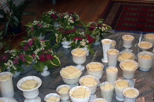Yesterday I filled all the vases with oasis. Since the regular, green Oasis would have altered the look of the milk glass, I used Ivory Oasis. Then today Pamela and I started filling these containers with greens and flowers.