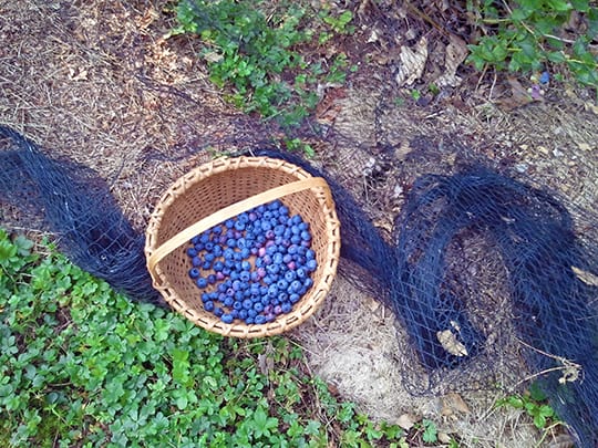 The covering has kept the birds away from the fruit but it means that in order to harvest the berries you either have to hunch over or get down at ground level to pick fruit. I decided that sitting among the bushes and picking from below was easier on the back, so I pulled up the netting, dropped to hands and knees and crawled into the blueberry patch.